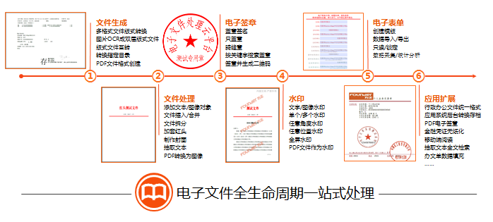 方正电子文件处理云平台是基于云架构的电子文件处理平台,集版式转换、文件合并/拆分、添加图文水印、电子签章、加套红头、表单数据导入导出等操作于一体,具备云端无人值守、持续稳定高速的处理能力,通过“保姆式”全程自动化独立服务模式,提供电子文件全生命周期“一站式”处理。